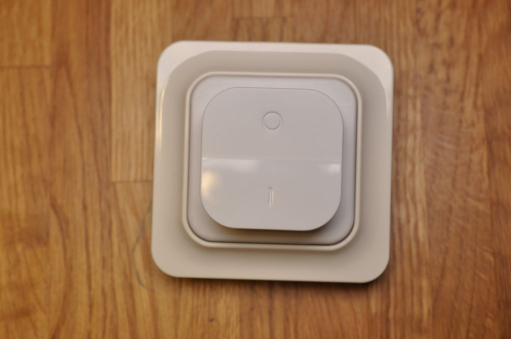Täcklock med plats för en IKEA Trådfri On/Off knapp som sätts i en befintlig ram till strömbrytare.