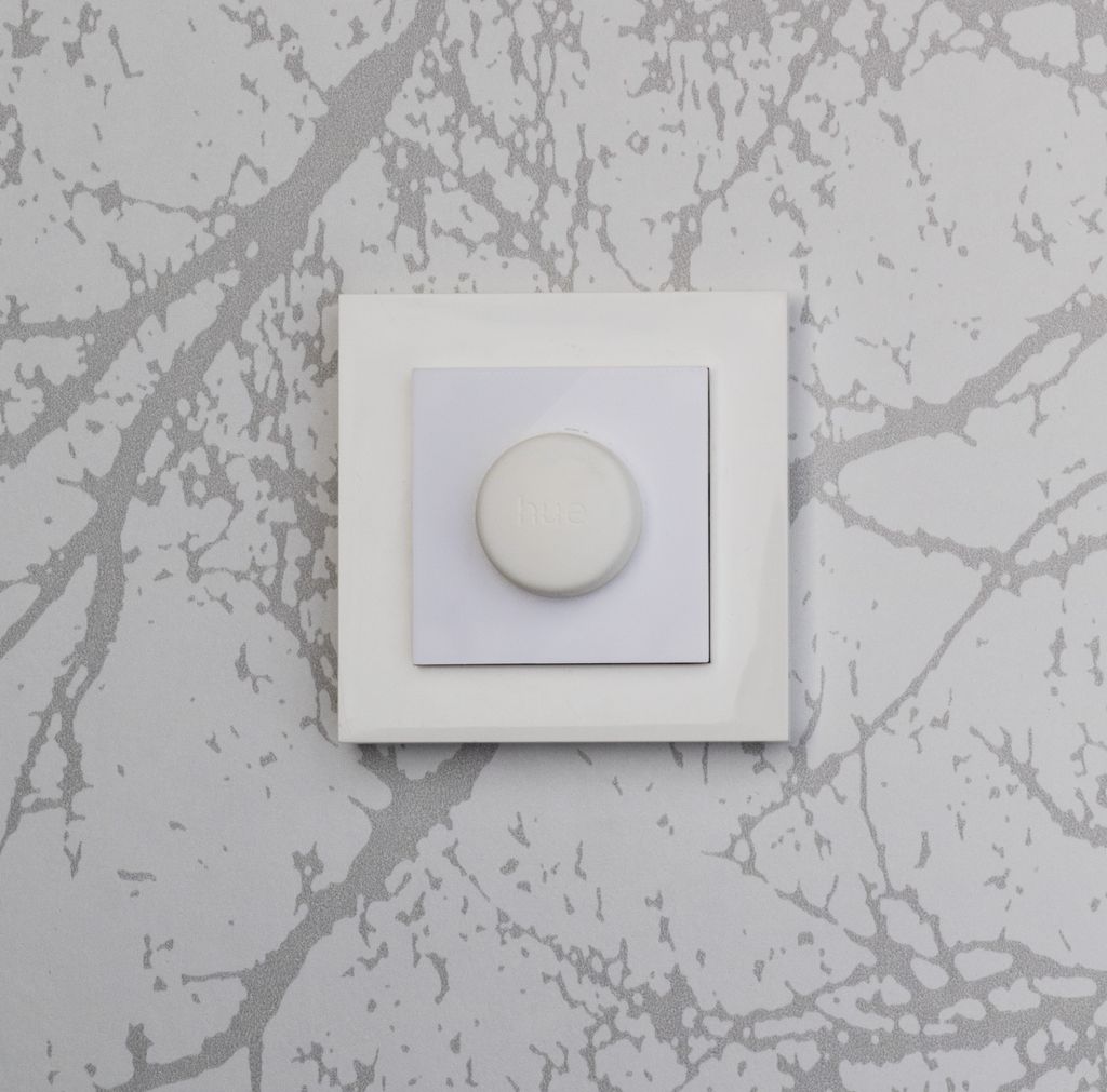 Täcklock med plats för en Philips Hue Smart Button som sätts i en befintlig ram till strömbrytare.