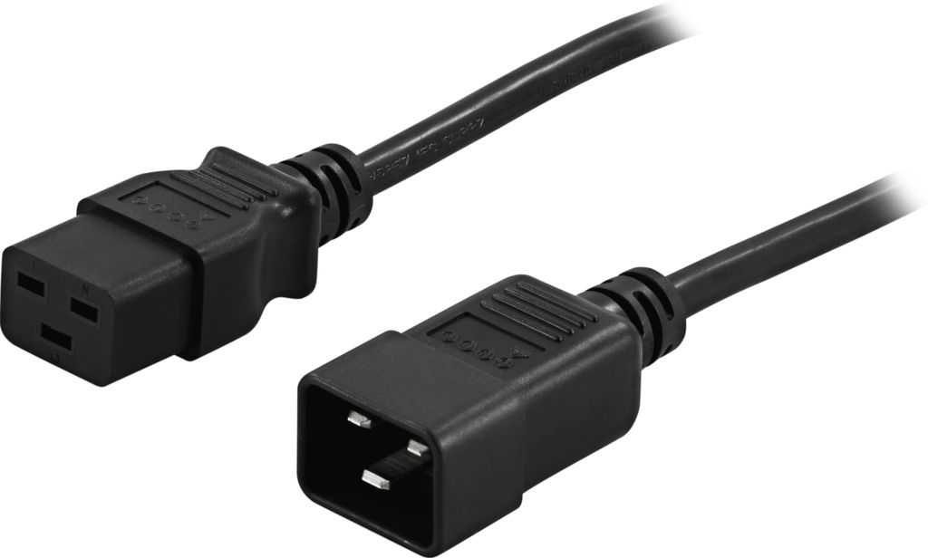 Beskrivning av Power cable 1m, IEC320 C19 - C20, 16 A / 250 V, black DELTACO grounded device/extension cable, straight IEC 60320 C19 to straight IEC 60320 C20, max 250V/16A, 1m, black.