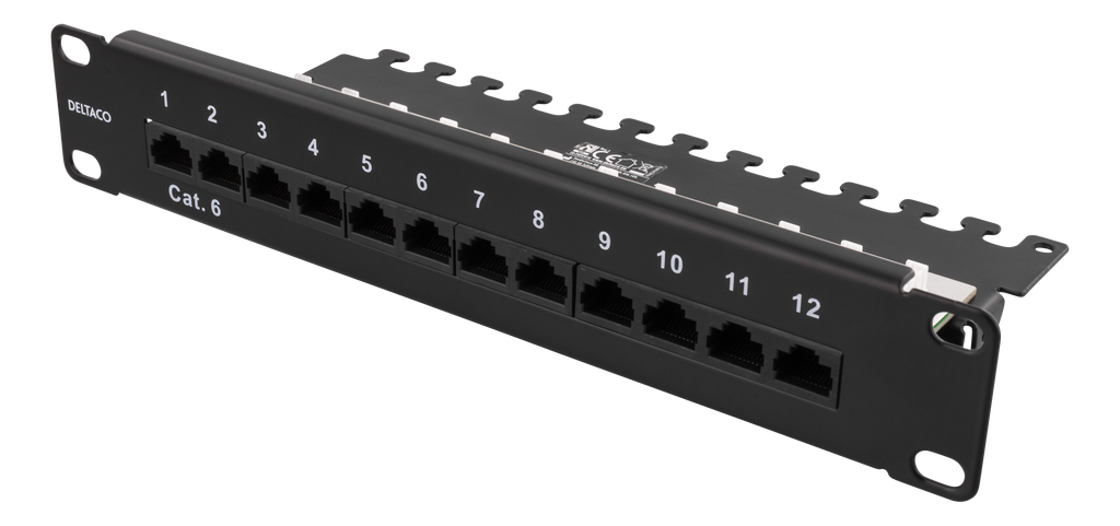DELTACO 10" patch panel, 12xRJ45, Cat6, 1U, Krone LSA, unshielded, metal, black