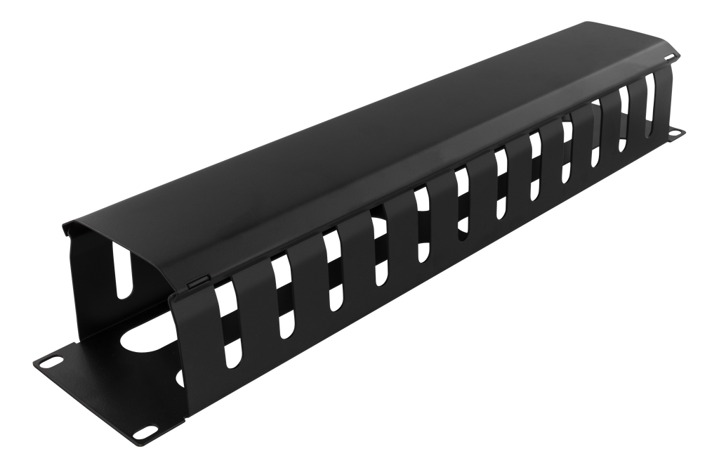 Kabelhanterare med genomföring av metall för horisontellt kabelmontage. Fingerkanalen har ett lock för att med lätthet lägga i- och ta ur kablar.