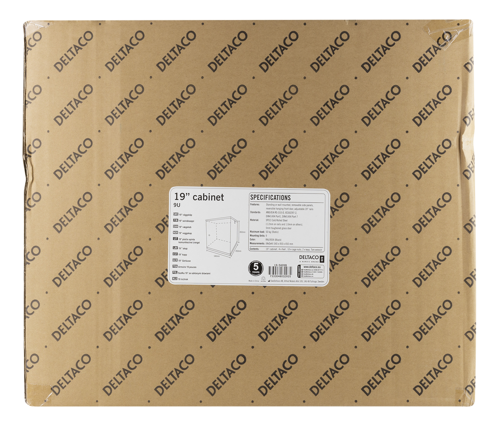 Beskrivning av DELTACO 19" cabinet, 9U, 540x450mm, standing or wall-mounted, glass door, black.