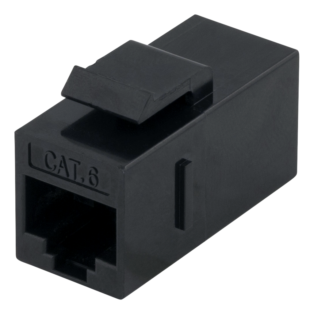 Beskrivning av DELTACO Cat6 Keystone-skarv, oskärmat, 2xRJ45, plast, 180, svart