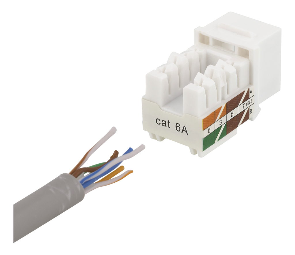 Ett uttag för montering i Keystone-produkter. Termineras "Tool-free" eller med ett 110-verktyg.