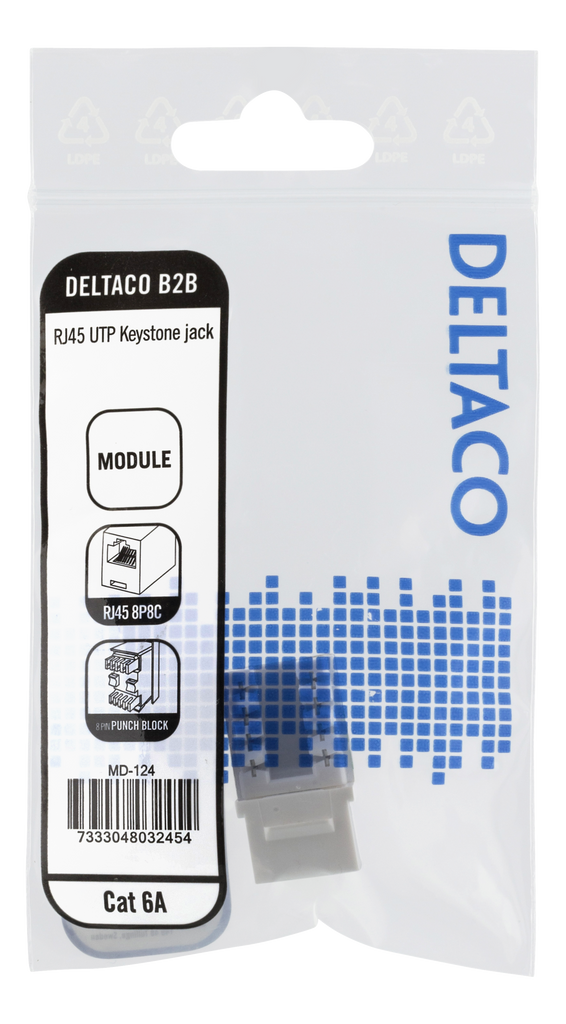 Beskrivning av DELTACO Cat6A Keystone-uttag, "Tool-free"/110, plast, 90, vit