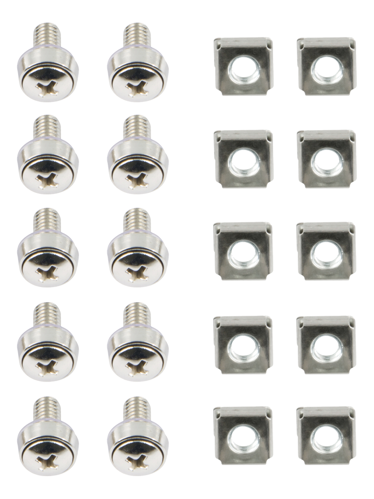 Beskrivning av DELTACO, M6 screw set, star, (washers + screws + nuts) 10 pieces. DELTACO, M6 screw kit, star, (washers + screws + nuts) 10-pack Compatible only with 19-series cabinets.