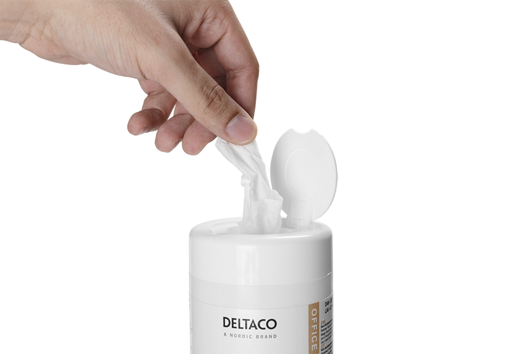 DELTACO OFFICE antibacterial cleaning wipes with chlorine-based formula are designed for cleaning and disinfecting electronic devices, especially screens.