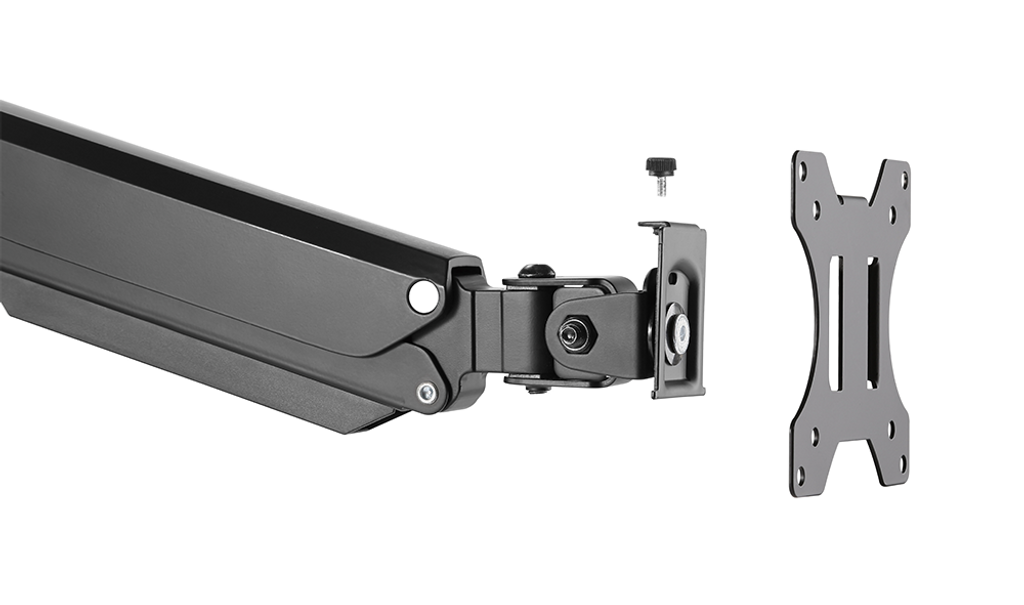 ARM-0352 has shorter arms designed to work perfectly for small workspaces. Most larger mounts cannot provide the same seamless look with dual monitors due to less space and their longer arms. With ARM-0352's short arm design, you can still use multiple monitors that sit close to walls or in office landscapes with small spaces. The desk mount is VESA compatible with dimensions 75x75, 100x100.