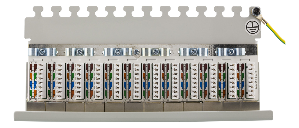 En patchpanel med 12st RJ45-portar anpassad för installation direkt på plana ytor då det finns två hål på undersidan kan den lätt sättas på t.ex. en vägg. På baksidan sitter ett täcklock som enkelt skruvas på och av för att skydda krone-plintar och kablage. Kablaget går också att skruva fast för en säker installation.