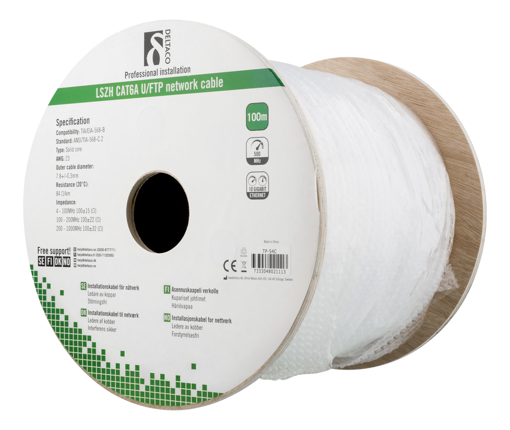 Beskrivning av DELTACO U/FTP Cat6a installation cable, 100m drum, 500MHz, LSZH, white.