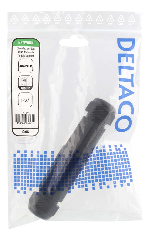 DELTACO water and dustproof connector for patch cables, 2x RJ45, Cat6, shielded, IP67, black