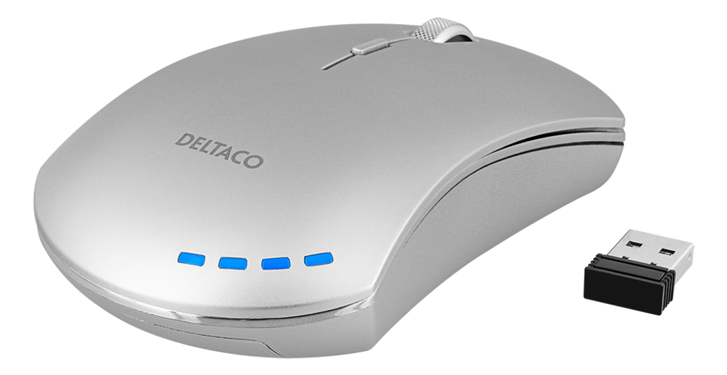 Trådlös mus med optisk sensor och tysta klickar samt skroll. Musen är en sån kallad Silent mouse, och har nästintill ljudlös vänster och högerklick. Förutom den minskade ljudnivån ger musen en mycket behagligare känsla vid användning. Musen är utrustad med ett uppladdningsbart batteri på 600 mAh som gör det smidigt att ladda vid behov. Den är även utrustad med en avstäningsbar LED-batteriindikator för att se när batteriet börjar ta slut. Tycker man att LED-ljuset är störigt kan man stänga av det på knappen på undersidan av musen.