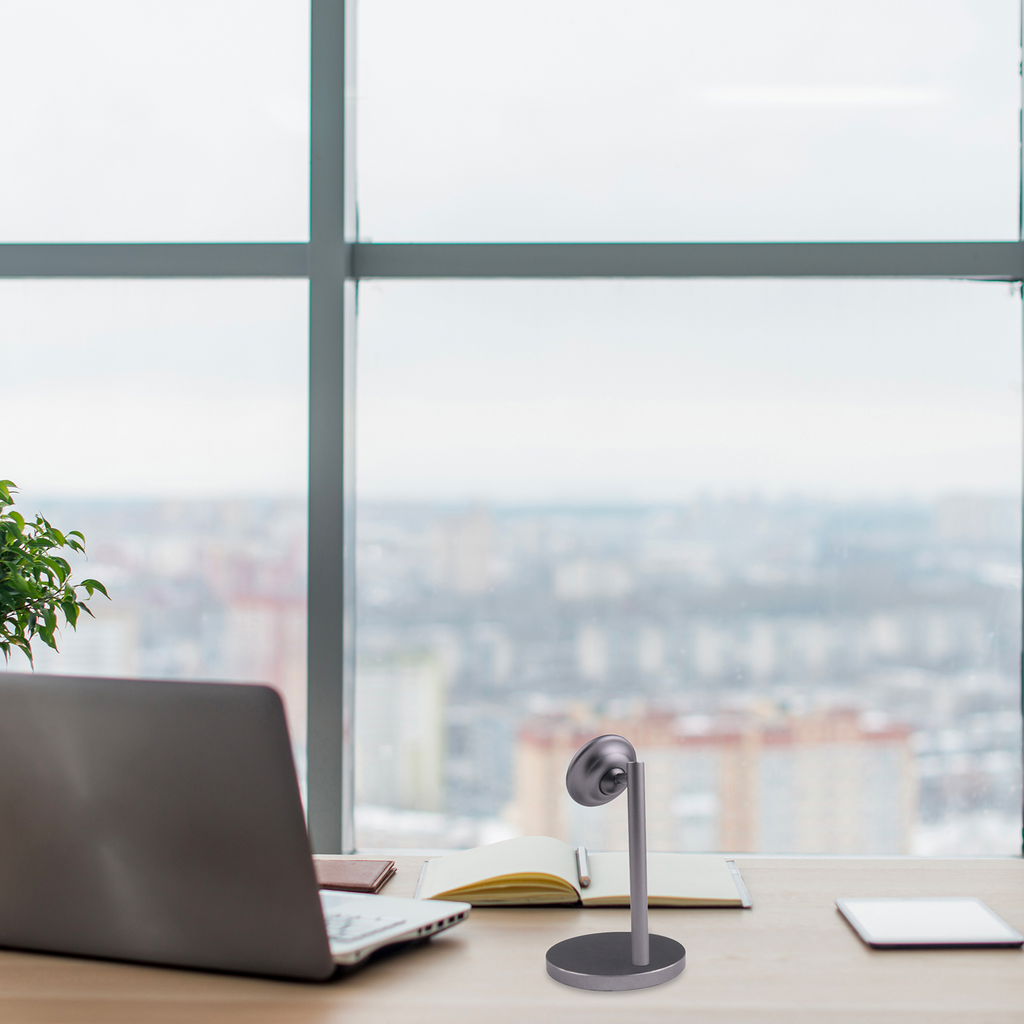 Ghost Desk is a universal aluminum magnetic holder for desktops. The base has a sticky surface that allows you to attach and detach the holder repeatedly without damaging the mounting surface.