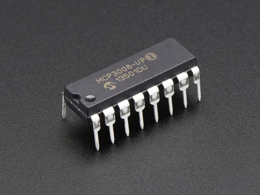Need to add analog inputs? This chip will add 8 channels of 10-bit analog input to your microcontroller or microcomputer project. It's super easy to use and uses SPI, so only 4 pins are required. We chose this chip as a great accompaniment to the Raspberry Pi computer because it's fun to have analog inputs but the Pi does not have an ADC.