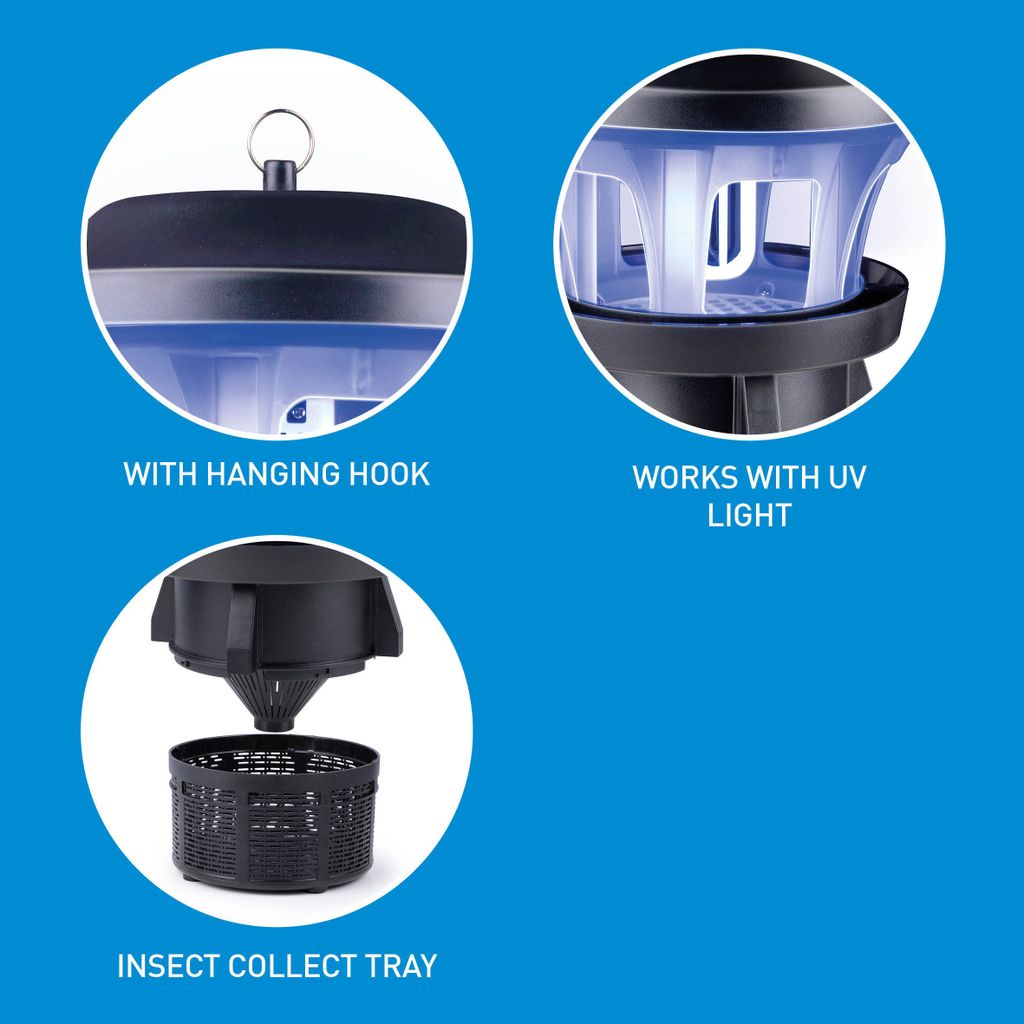 The mosquito trap can be hung using a hook or placed on legs.