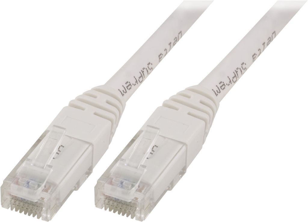 Beskrivning av Network cable 3m U/UTP Cat5e, white DELTACO U/UTP Cat5e patch cable, 3m, 100MHz, Delta-certified, whiteNetwork cable with molded RJ45 connectors.