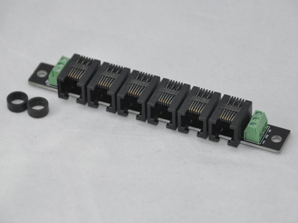 The patch panel has 6 RJ12 female connectors and 2 screw terminals for GND, DQ, and +5V.