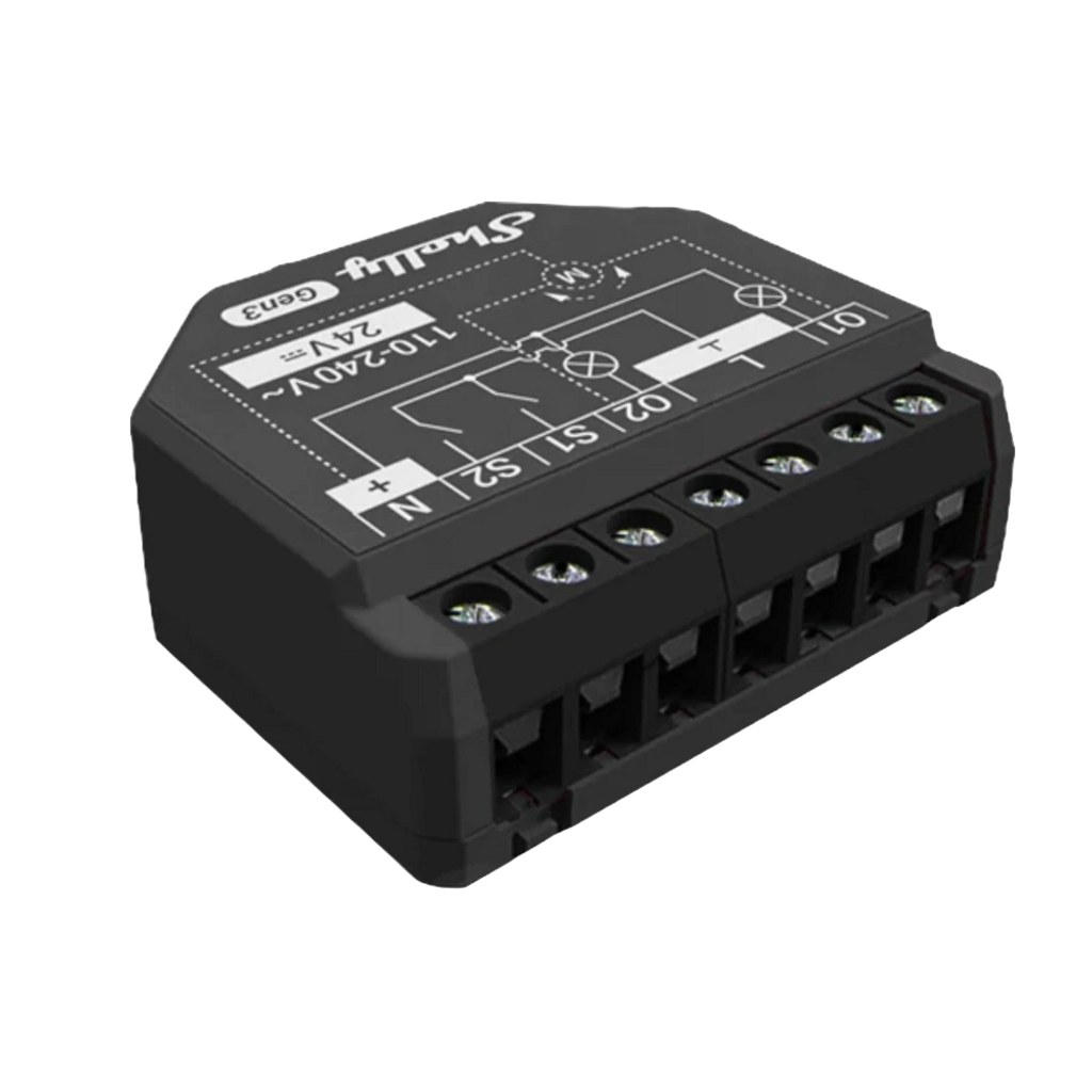 Shelly 2PM Gen3 är ett WiFi-styrt 2-kanals relä som främst är lämpligt för automatisering av rullgardiner, persienner, markiser och alla tvåvägs AC-motorer. De två integrerade effektmätarna möjliggör samtidig mätning av förbrukningen för varje kanal separat (PM = Power Metering), vilket gör enheten också lämplig för styrning av två ljuskanaler eller två vägguttag.