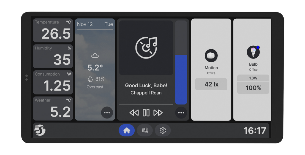 På enhetens hemskärm får du snabb tillgång till dina favoritapparater och scener. Shelly Wall Display låter dig dessutom styra Bluetooth- och Sonos-högtalare samt använda den inbyggda termostaten för att reglera rummets temperatur. Skärmen visar även aktuell energiförbrukning, temperatur och luftfuktighet i rummet.