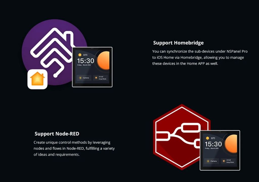 Den smarta kontrollpanelen kan även agera eWeLink gateway för att lägga till R5 eller S-mate och således styra enheter placerade på olika platser i ditt hem och erbjuder open API som möjliggör integration mot tredjepart och med HTTP API kan du ta kontroll och styra din NSPanel.