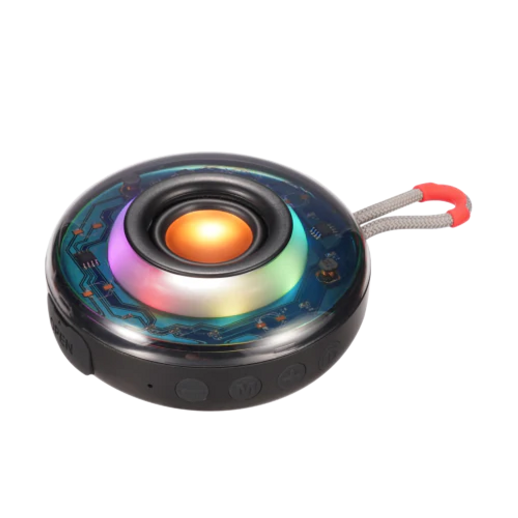 Denna Bluetooth-högtalare har en genomskinlig design med färgstarka LED-ljuseffekter som verkligen drar blickarna till sig. Den erbjuder True Wireless Stereo för högkvalitativt ljud och har lättanvända volym- och mediekontrollknappar.