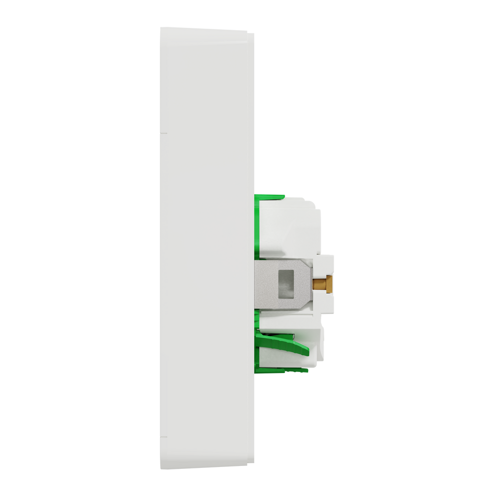 Exxact uppkopplat 2-vägs vägguttag 16 A för infällt montage med energimätning. Uttagets övre uttag är uppkopplat och kan styras via Wiser by SE-appen, samt manuellt via den fysiska tryckknappen. Med Wiser-appen kan olika tidsstyrningsmöjligheter konfigureras såsom veckobaserad styrning, schemaläggning och astrostyrning.