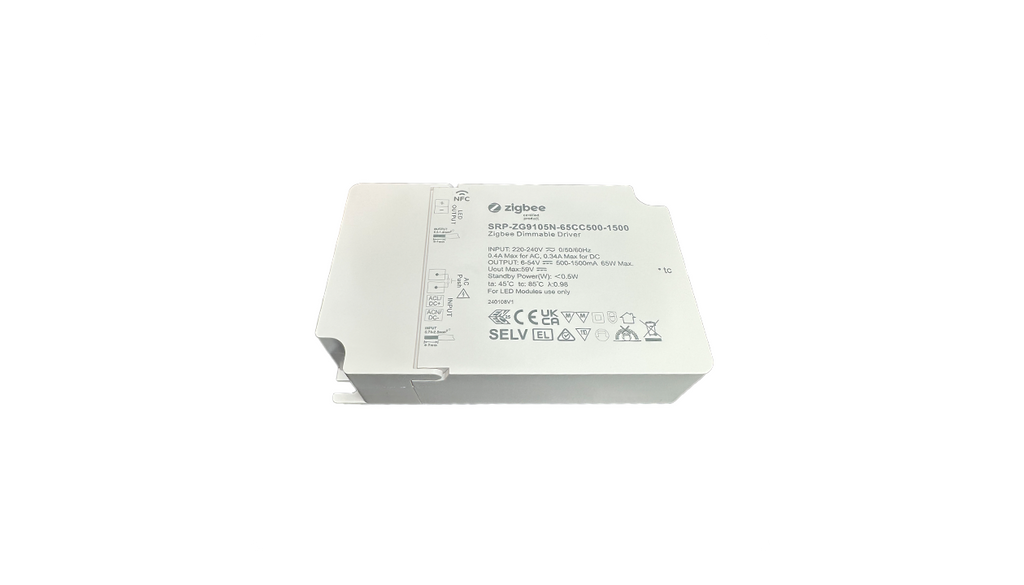 Den Zigbee 3.0 NFC-Enabled LED Driver är en avancerad dimbar LED-driver som är idealisk för konstantströmsbelysning i smarta hem och professionella belysningssystem. Med en justerbar utström på 500-1500 mA via NFC-programmering ger den maximal flexibilitet och kontroll. Minsta strömsteg är så lågt som 0.1 mA, vilket möjliggör extremt precis styrning av ljusstyrkan.