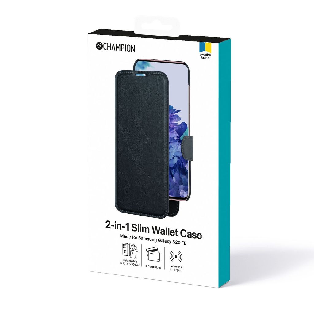 Champion 2-in-1 Slim Wallet Case skyddar din mobil mot tappskador och repor samtidigt som den fungerar som plånbok. Du får plats med fyra betalkort i kortfacken, kontanter i sedelfickan samtidigt som locket sitter säkert på plats med hjälp av ett magnetlås. Det avtagbara mobilskalet inuti plånboksfodralet är utrustad med magnetfäste och kan med fördel användas till bilhållare med magnet. Skalet är också försedd med en snygg gummerad antiglid-yta vilket är praktiskt om man vill använda skalet utan plånboksfodralet. Det avtagbara mobilskalet stödjer även trådlös laddning.
