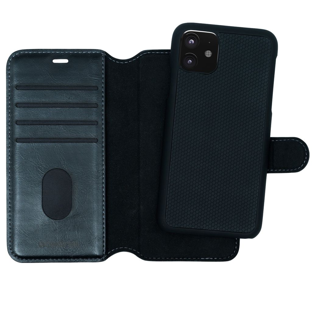 Champion 2-in-1 Slim Wallet Case skyddar din mobil mot tappskador och repor samtidigt som den fungerar som plånbok. Du får plats med fyra betalkort i kortfacken, kontanter i sedelfickan samtidigt som locket sitter säkert på plats med hjälp av ett magnetlås. Det avtagbara mobilskalet inuti plånboksfodralet är utrustad med magnetfäste och kan med fördel användas till bilhållare med magnet. Skalet är också försedd med en snygg gummerad antiglid-yta vilket är praktiskt om man vill använda skalet utan plånboksfodralet. Det avtagbara mobilskalet stödjer även trådlös laddning.