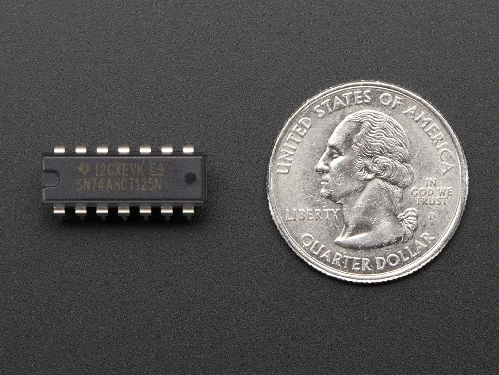 Level shifting chips let you connect 3V and 5V devices together safely. This chip is similar to others in the shop (such as the 74LVC125) except this one is particularly good at converting 3V logic up to 5V. This is in demand especially when connecting some 3V devices such as the Teensy 3 to NeoPixels! Just power the 74AHCT125 with 5V, it will detect 3V logic properly. You can also use it to connect 5V logic out to 3V logic in, that's when you want to power the 74AHCT125 with 3V, it can safely read 5V logic on the input pins.