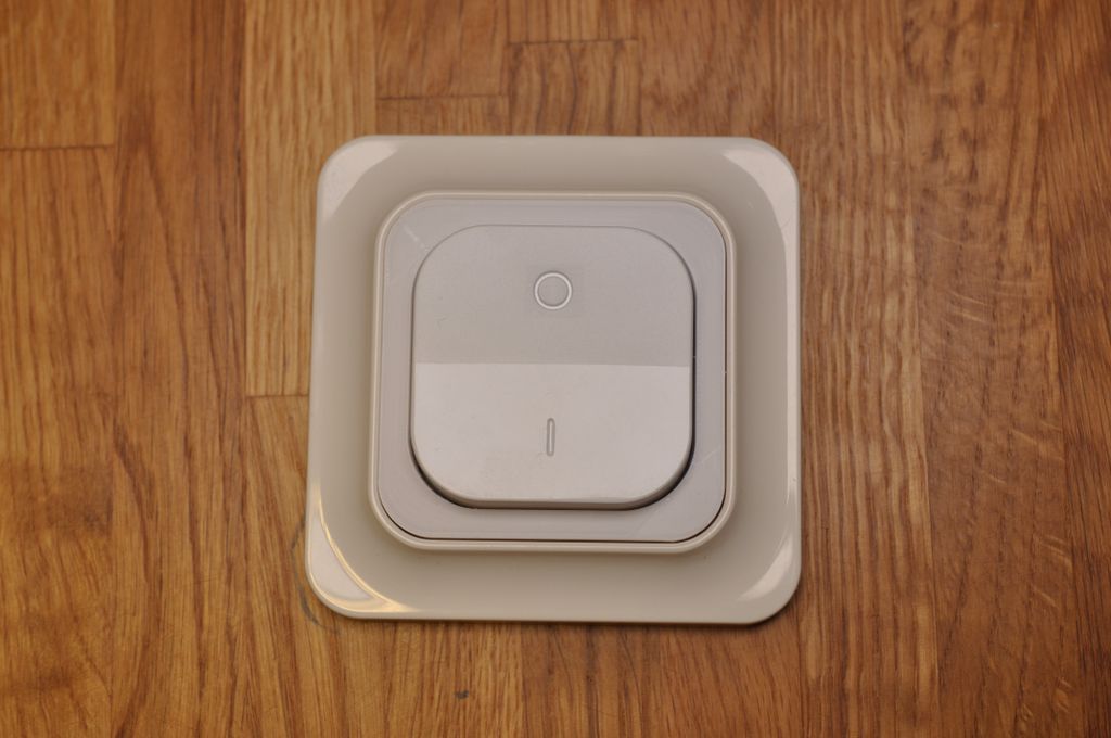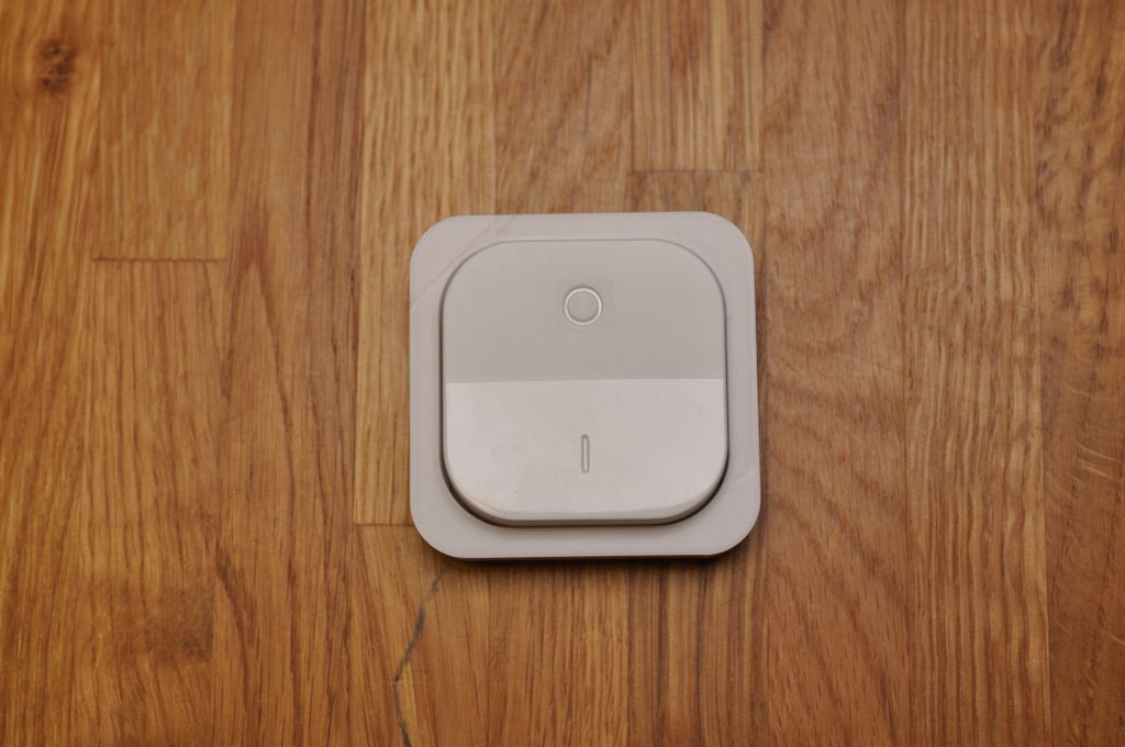 Hållare för att montera en IKEA Trådfri On/Off knapp i en en befintlig ram till strömbrytare. Vi rekommenderar att man byter ut befintlig enkelram till en dubbelram. Annars behöver man demontera befintlig brytare.