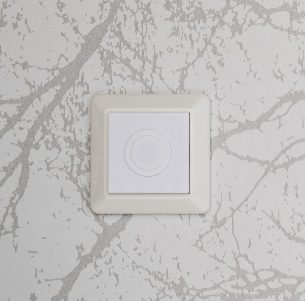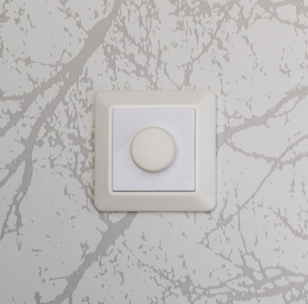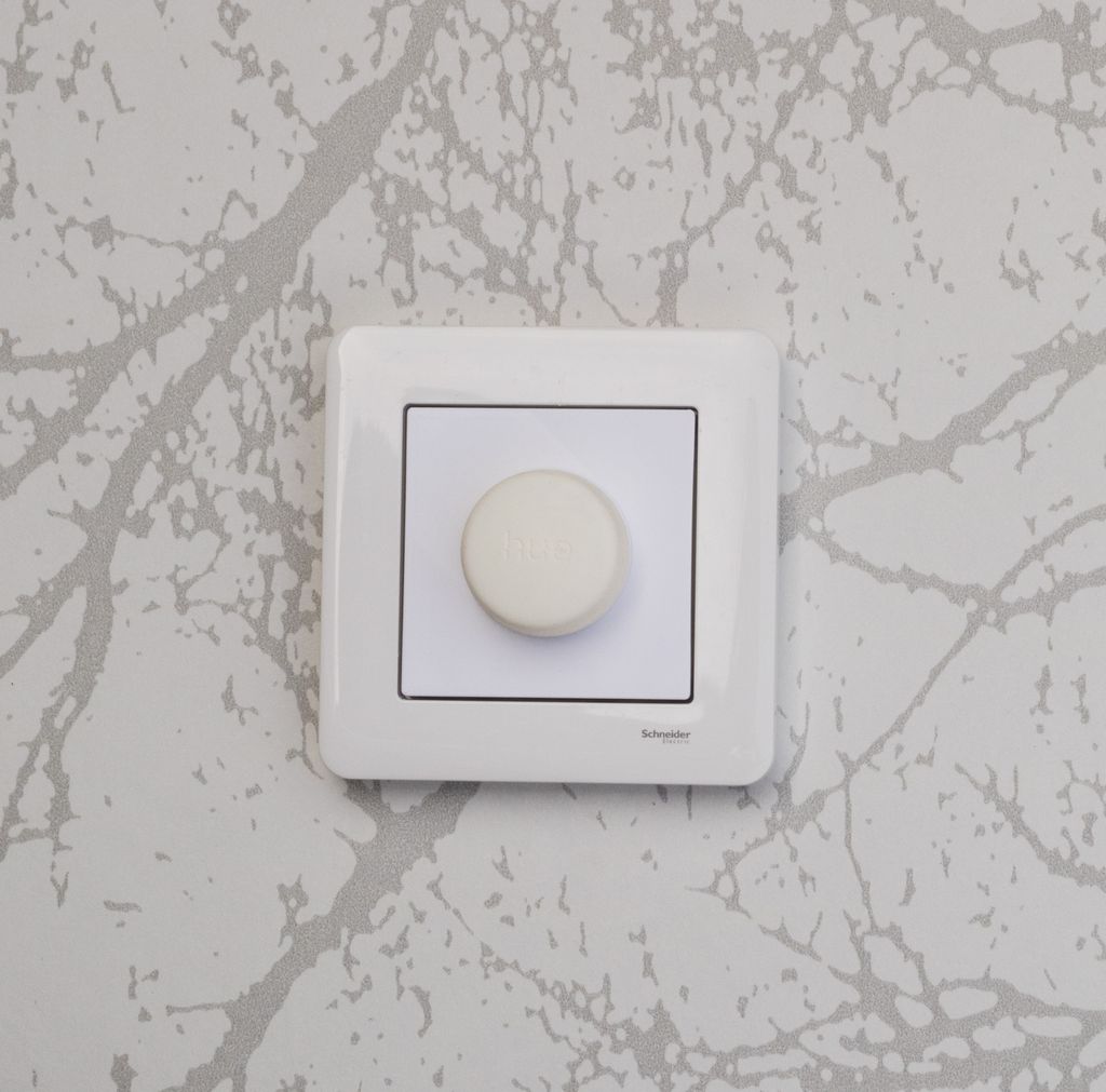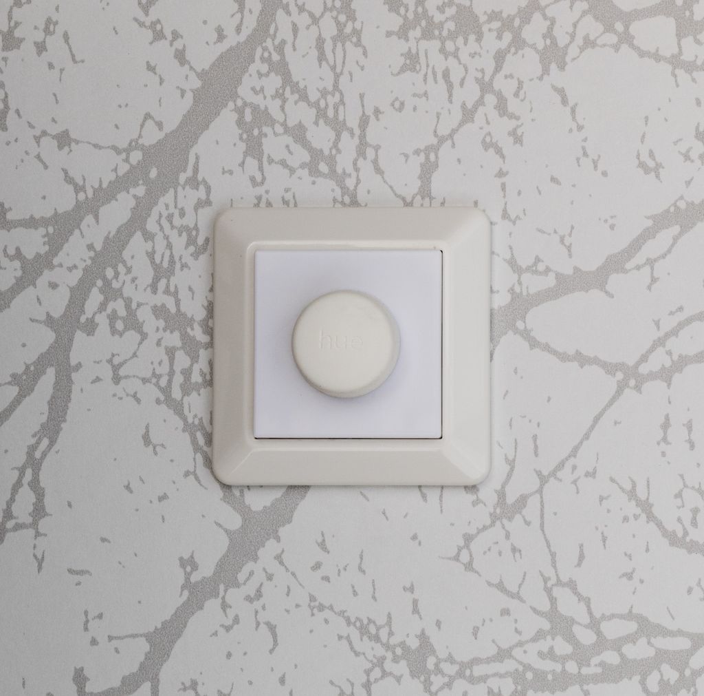 Täcklock med plats för en Philips Hue Smart Button som sätts i en befintlig ram till strömbrytare.