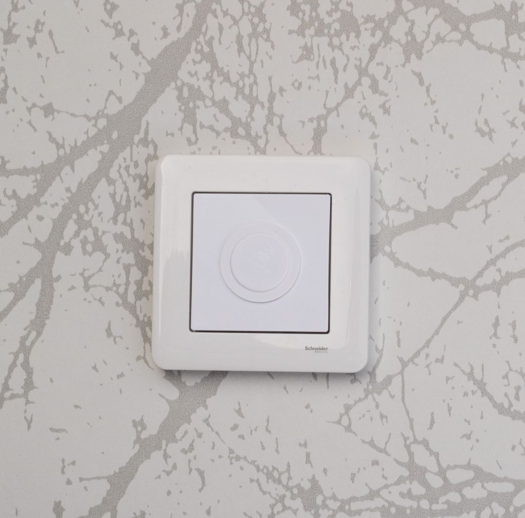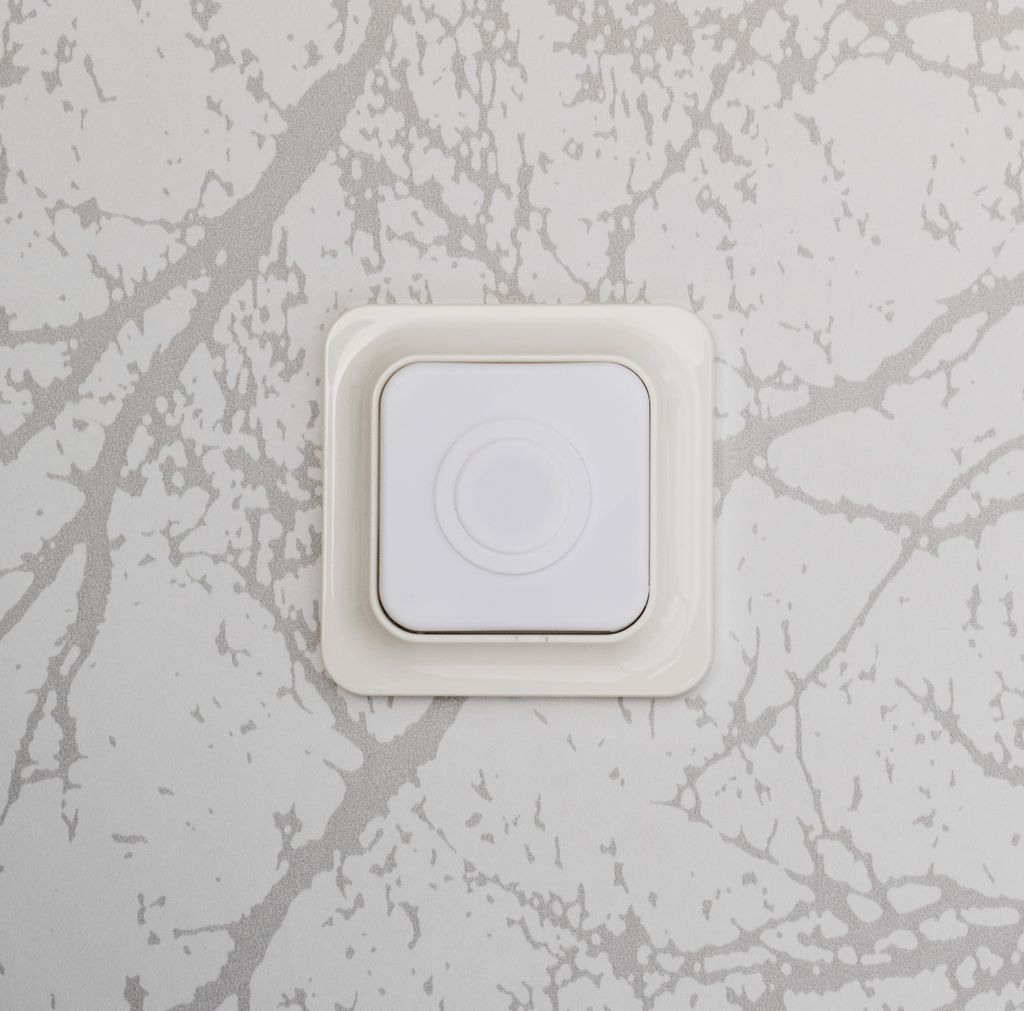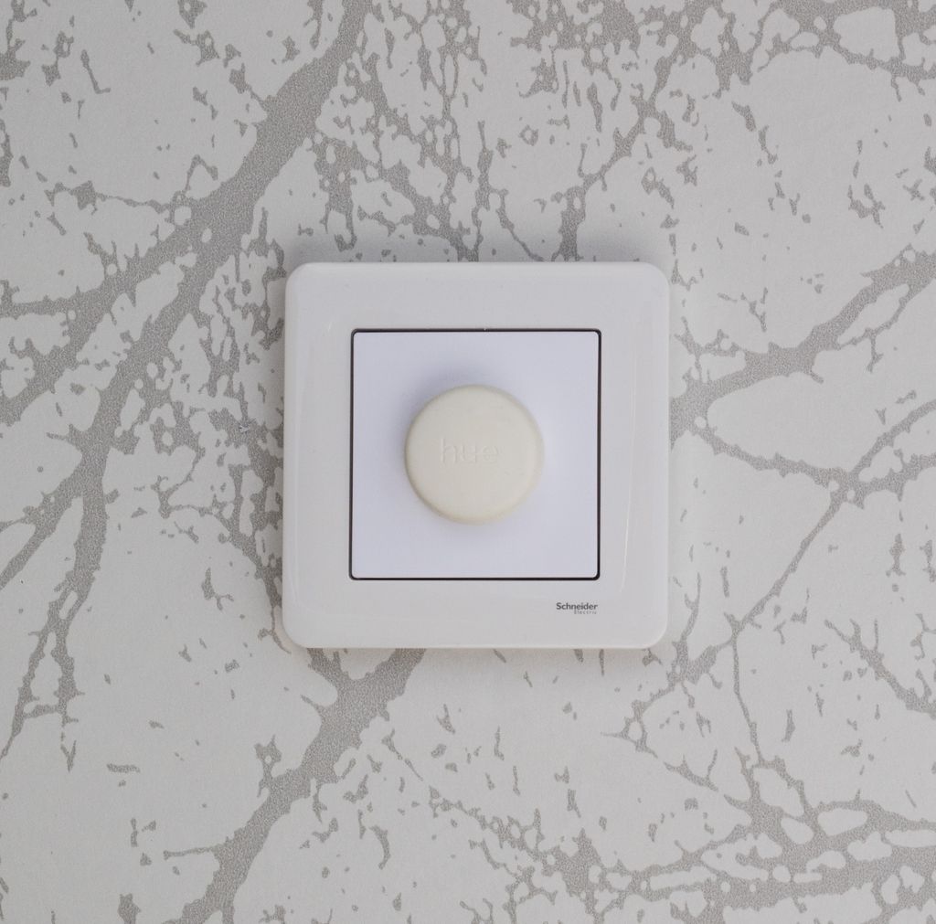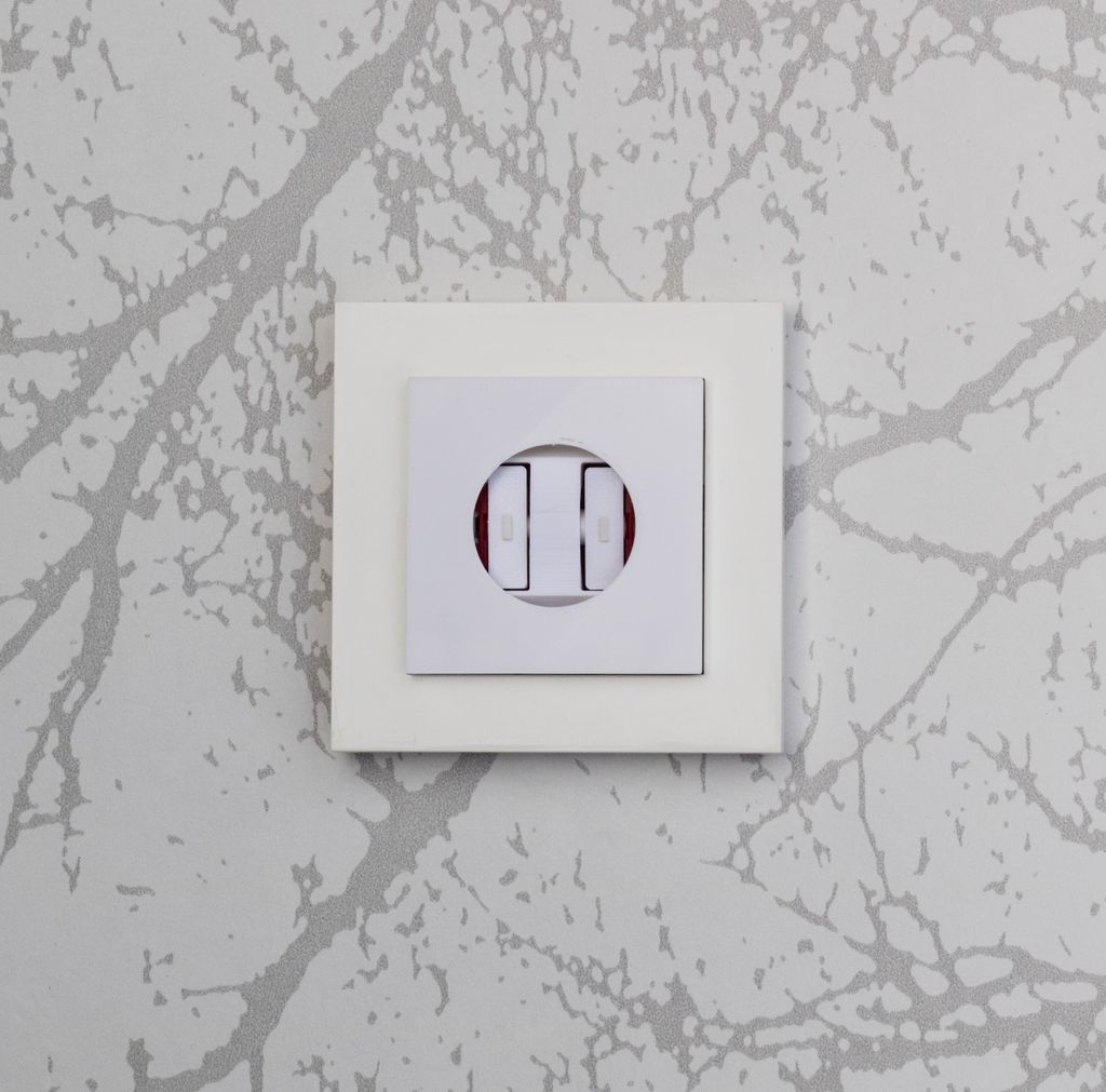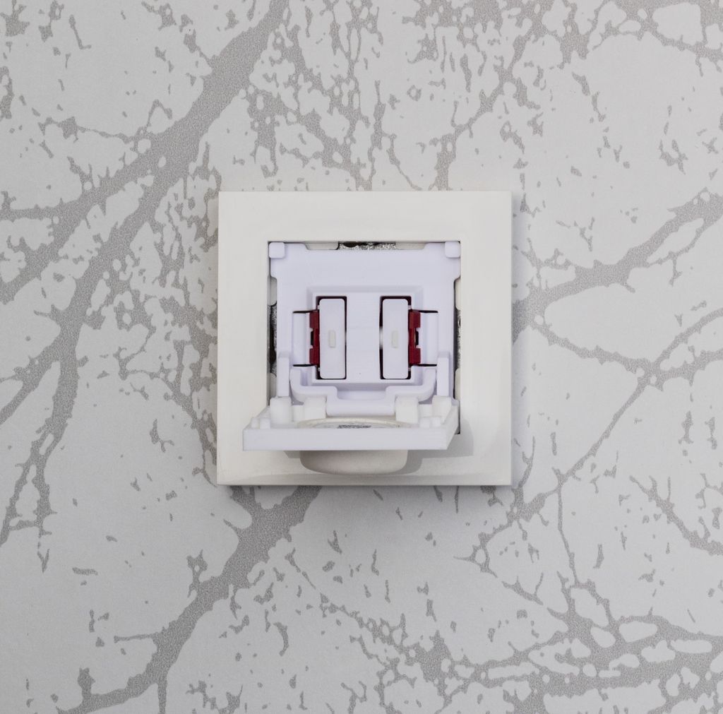 Täcklock med plats för en Philips Hue Smart Button som sätts i en befintlig ram till strömbrytare.