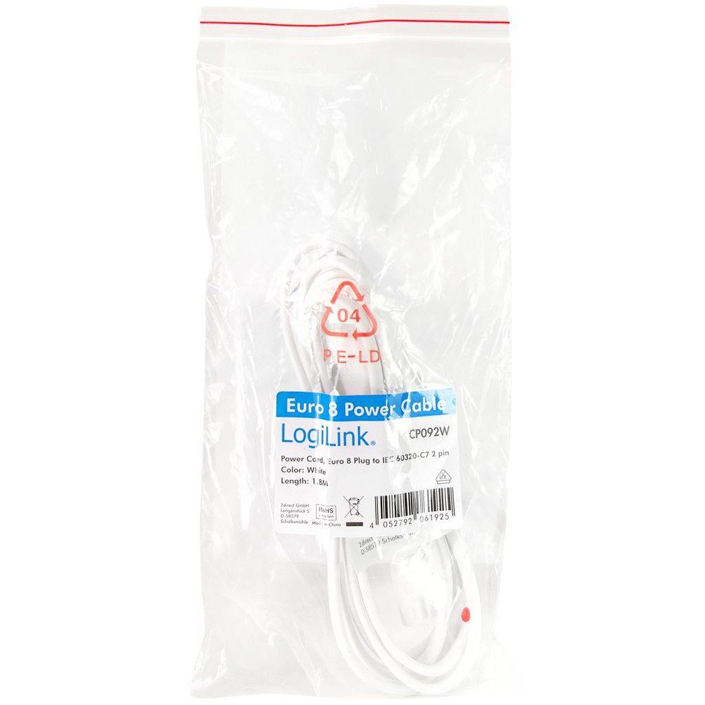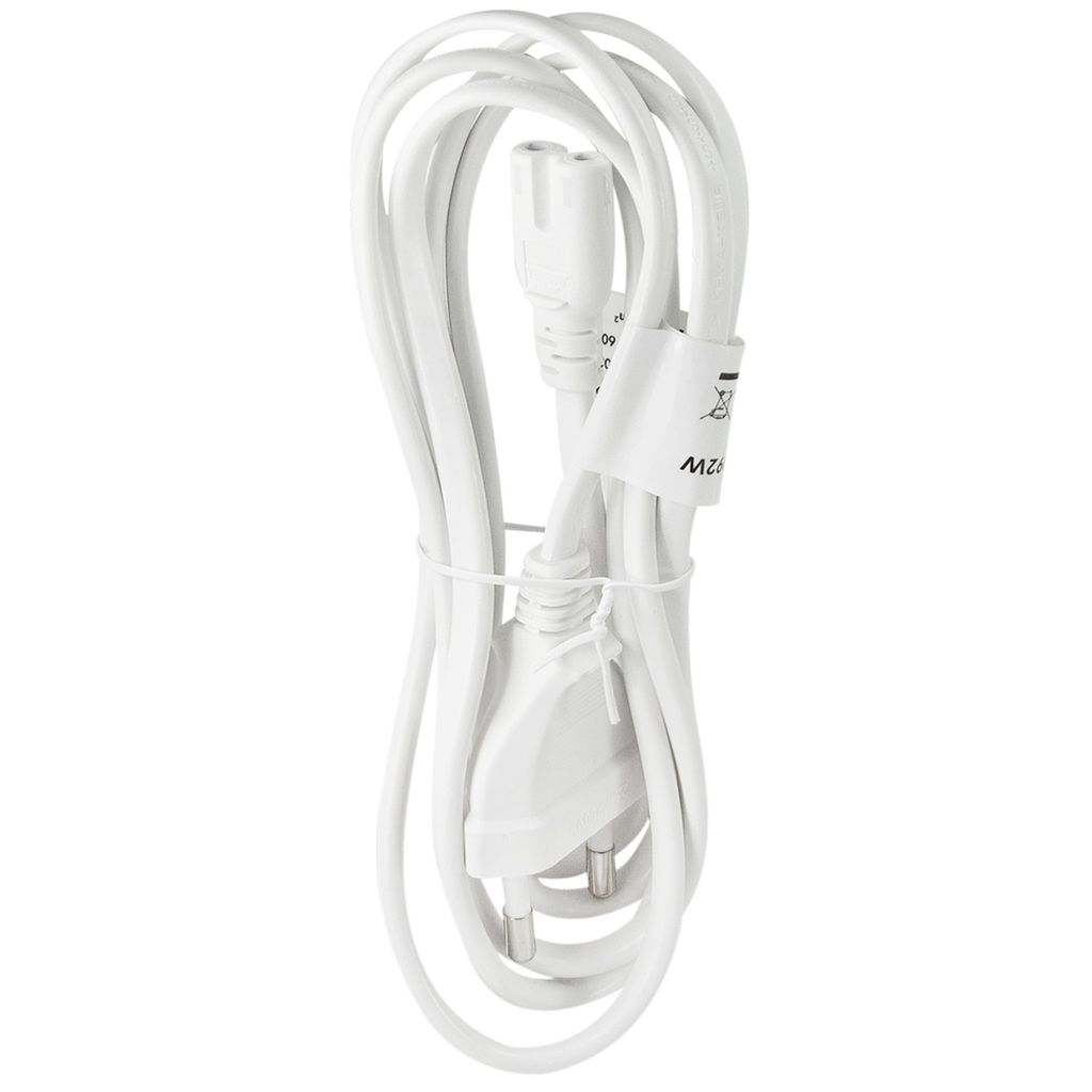 Strömkontakterna är raka. Kabeln är vit och är 1,80 meter lång.