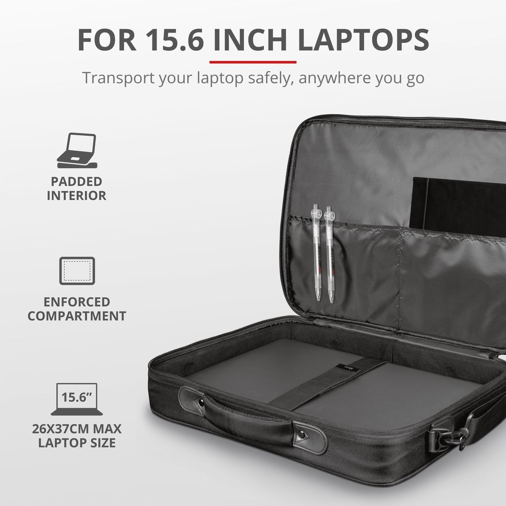 De vadderade facken skyddar din bärbara dator och dina tillhörigheter från att skadas. Med dragkedjorna av metall och kardborrebanden förblir din bärbara dator säker när du rör dig från plats till plats. Bär din bärbara dator i handremmen eller använd den justerbara axelremmen som medföljer. De flesta bärbara datorer upp till 15,6 tum passar i Trust Atlanta.
