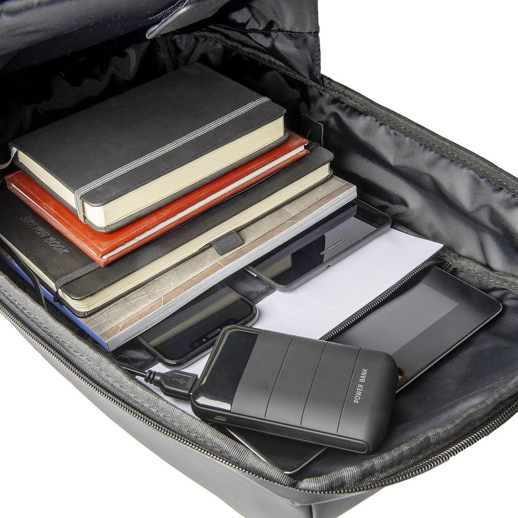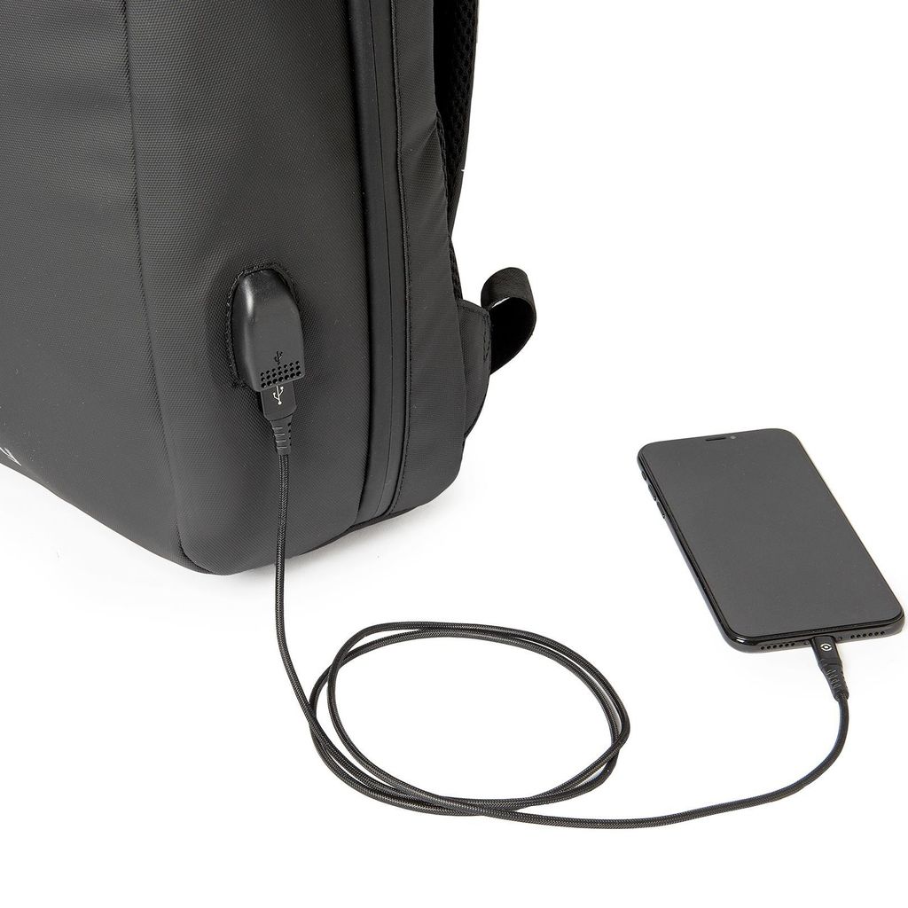 Ryggsäcken är utrustad med en USB-port med integrerad kabel som gör att du kan ladda din smartphone även när du är på språng.