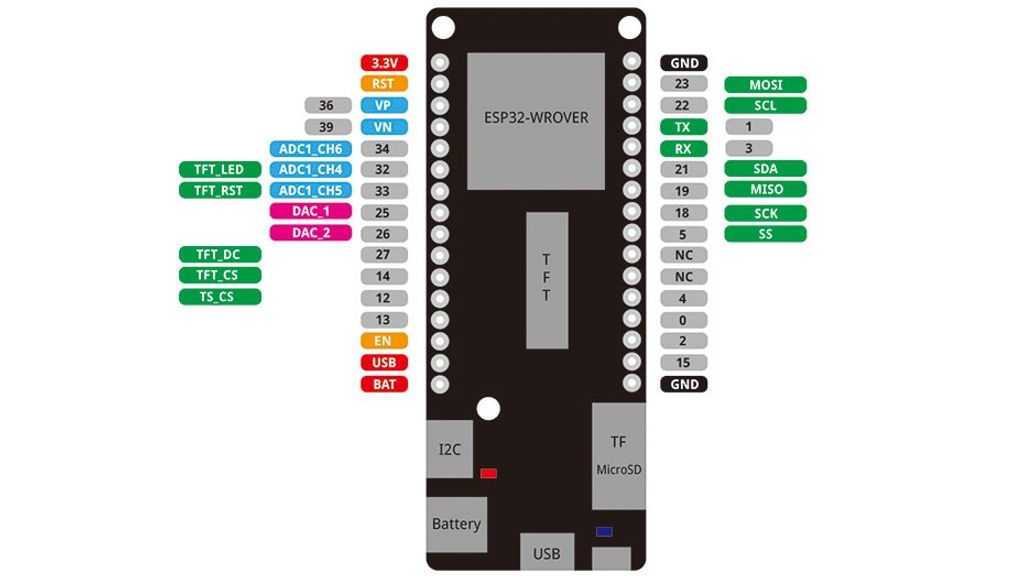 Förutom detta finns också en JST-kontakt till vilken man kan ansluta ett LiPoly-batteri på 3.7v, för portabel användning. På kortet finns också I2C- och TFT-kontakter vilka fungerar med LoLins kompatibla tillbehör.
