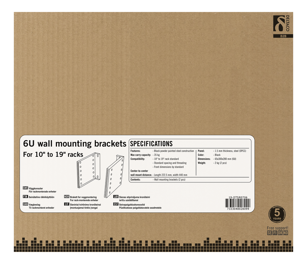 DELTACO 10"-19" väggstativ med justerbar bredd, 6U, 35kg last, stål, svart