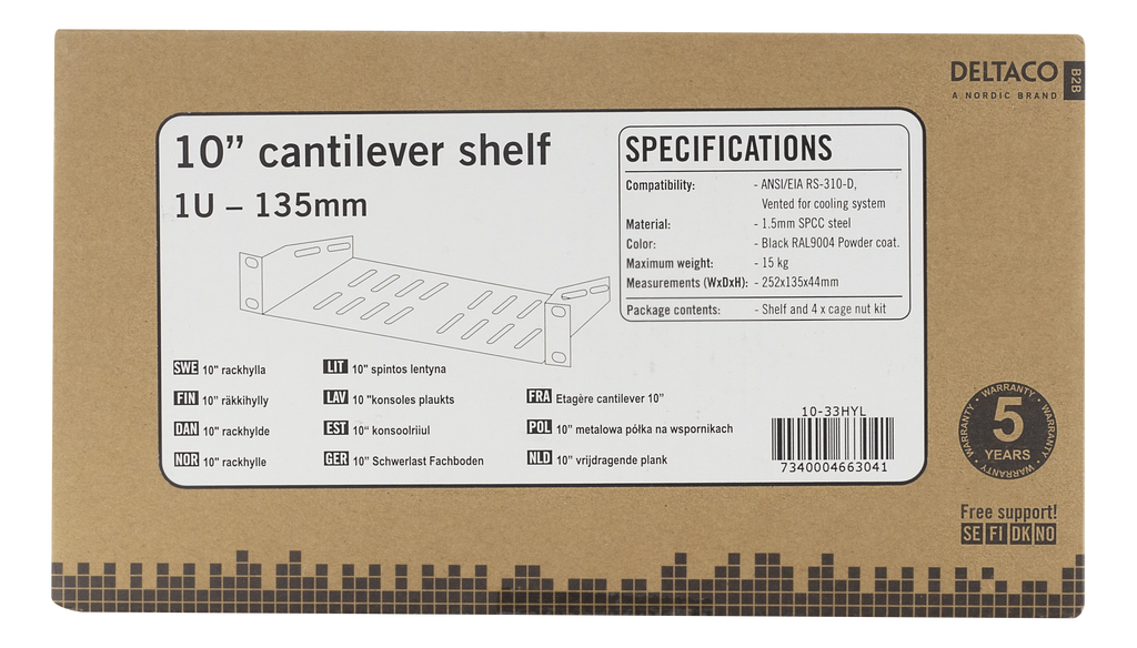Produktbeskrivning DELTACO 10" fast hylla, 1U, 136mm djup, svartLevereras med 4 skruvsatser för montering i skåp.Mått(BxDxH): 250x136x44mm.