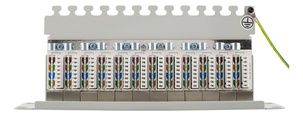 Skärmad patchpanel med 12st RJ45-portar anpassad för montering i 10" rack. På baksidan sitter ett täcklock som enkelt skruvas på och av för att skydda krone-plintar och kablage. Kablaget går också att skruva fast för en säker installation.