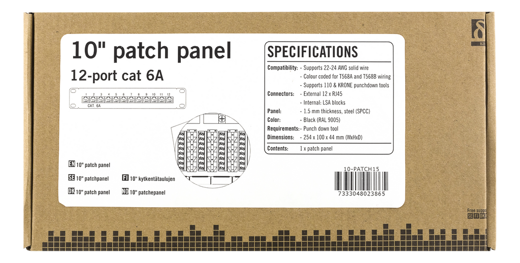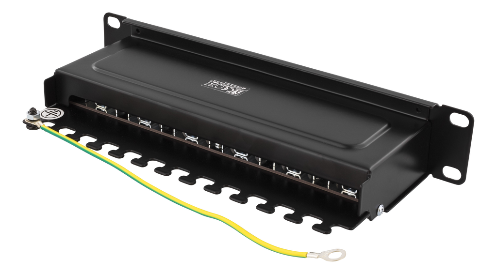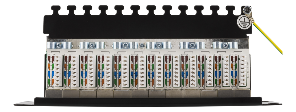 Skärmad patchpanel med 12st RJ45-portar anpassad för montering i 10" rack. På baksidan sitter ett täcklock som enkelt skruvas på och av för att skydda krone-plintar och kablage. Kablaget går också att skruva fast för en säker installation.