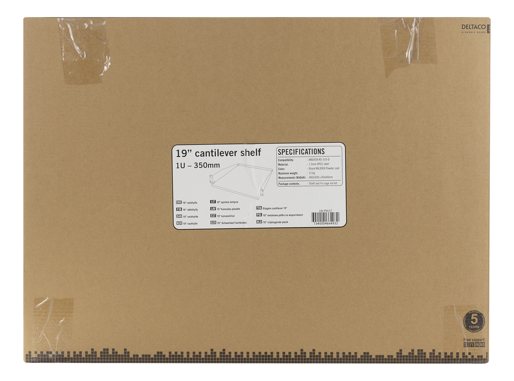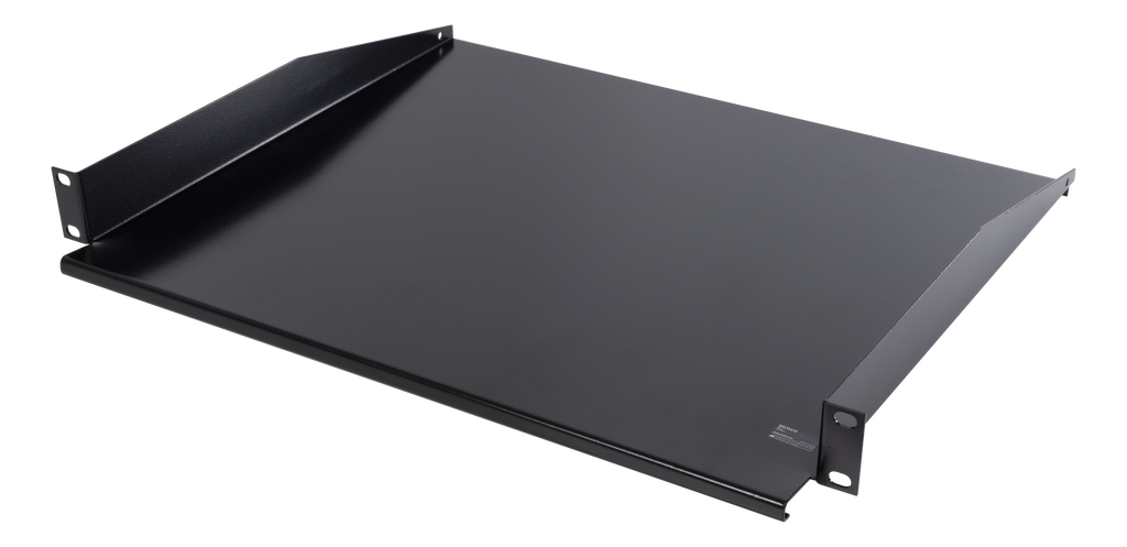 Produktbeskrivning DELTACO, 19" fast hylla, 1U, 381mm djup, max 8kg, svartDen bygger ut 30mm från 19" vinklarna.