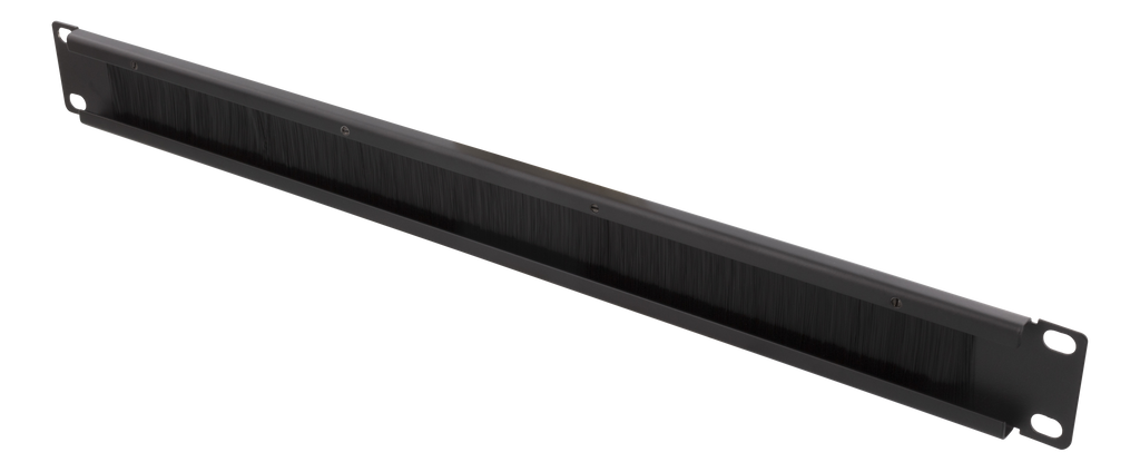 Kabelgenomföring med en ram av metall och tät nylonborste, monteras i 19"-rack där den tar upp 1 Unit i utrymme.