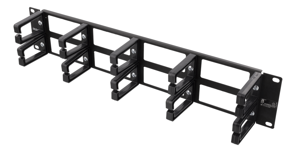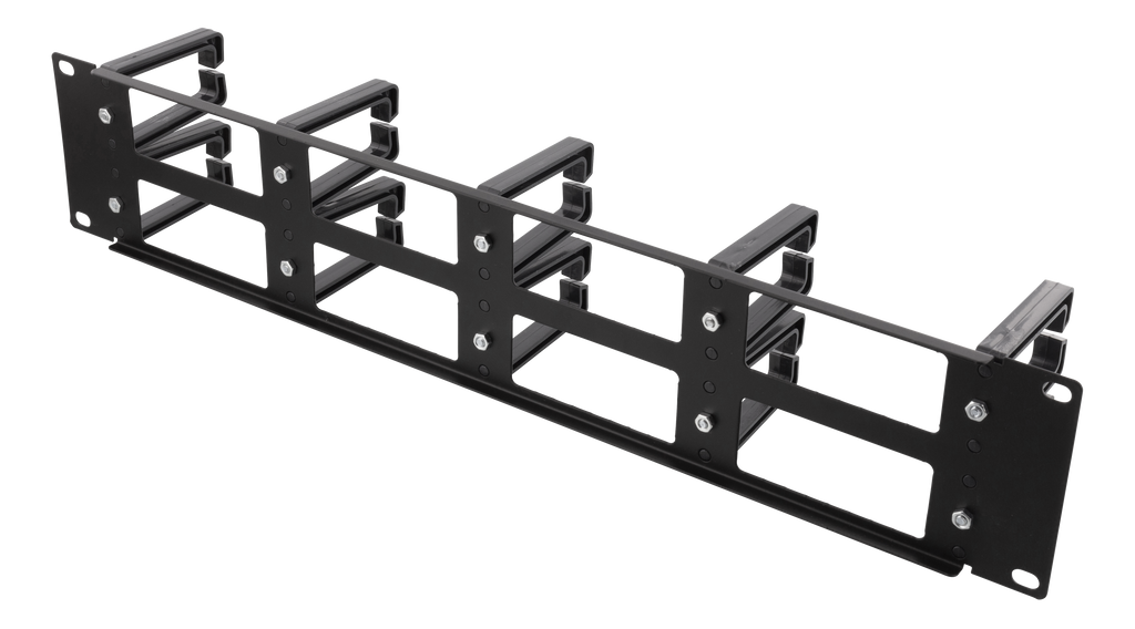 Kabelhanterare med genomföring av metall och plast för horisontellt kabelmontage. Öglorna är gjorda av spänstig plast för att med lätthet lägga i- och ta ur kablar samtidigt som de ligger på plats.
