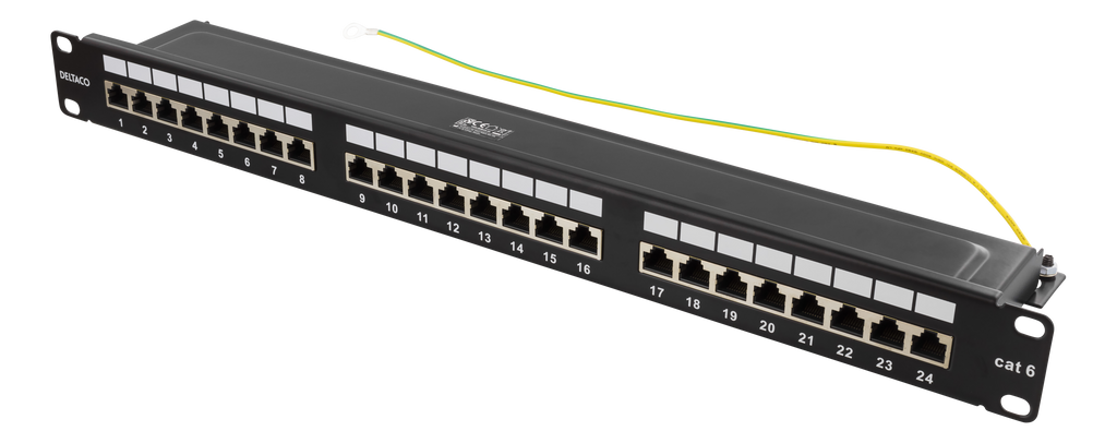 DELTACO 19" patchpanel, 24xRJ45, Cat6, STP, 1U, 10Gbps, krone-plintar, metall, svart