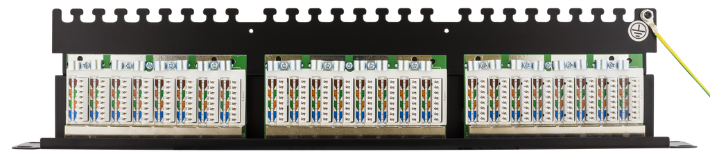 Skärmad patchpanel med 24st RJ45-portar anpassad för montering i 19" rack. På baksidan sitter ett täcklock som enkelt skruvas på och av för att skydda krone-plintar och kablage. Kablaget går också att skruva fast för en säker installation.-