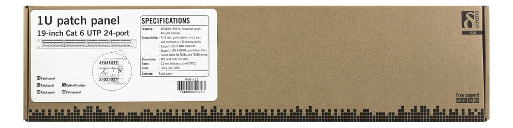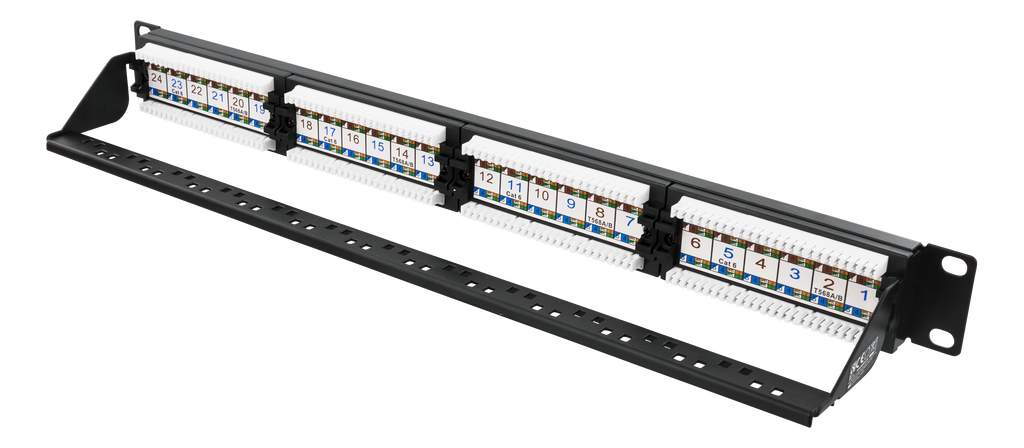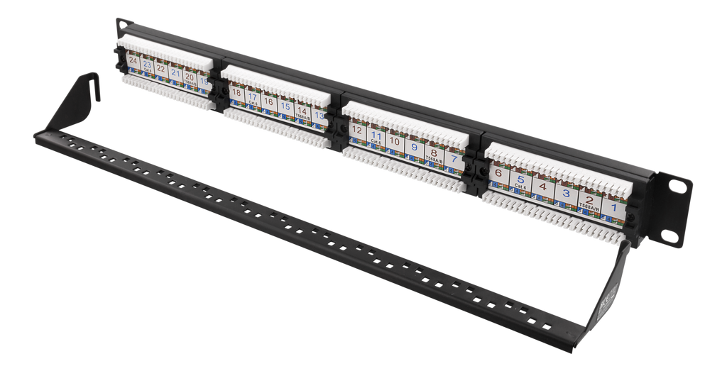 Oskärmad patchpanel för montering i 19" rack. Installationen görs enkelt via krone-plintar som är färgkodade. På baksidan finns ett kabelstöd för en smidig installation, kabelstödet går att ta bort om så önskas.