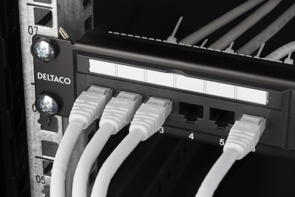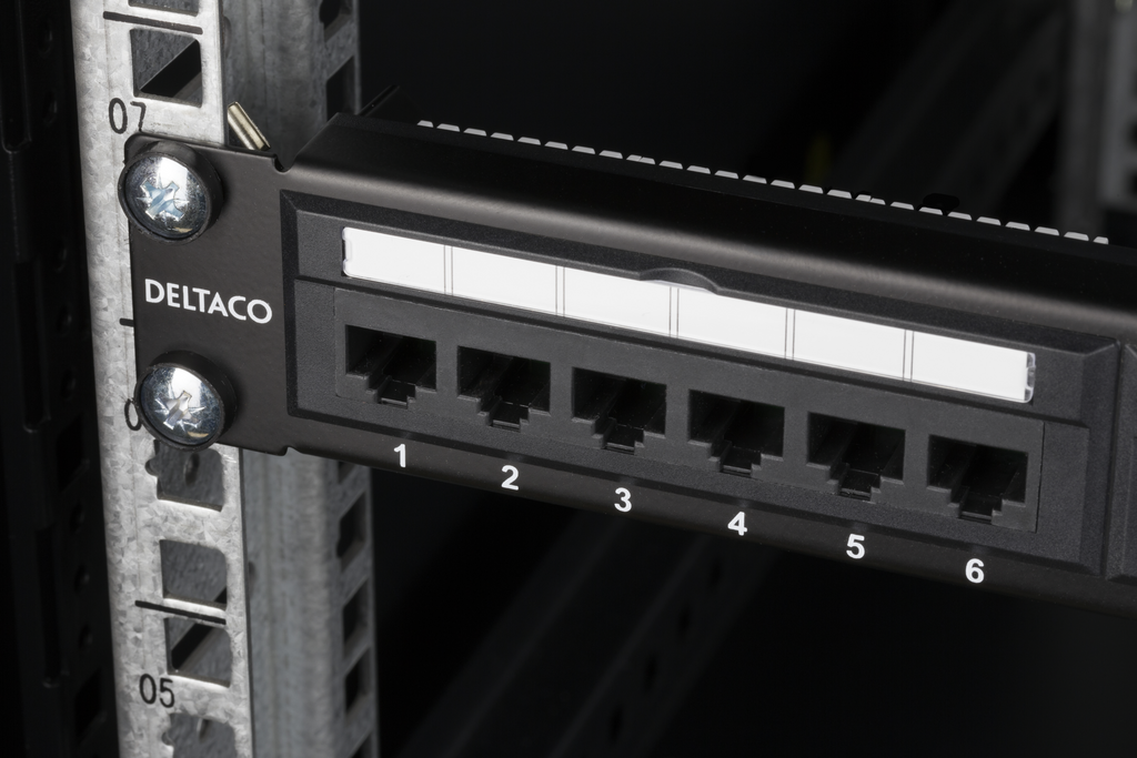 DELTACO 19" patchpanel, 24xRJ45, Cat6, UTP, 1U, 10Gbps, krone-plintar, metall, svart