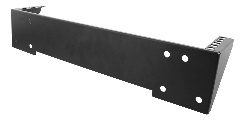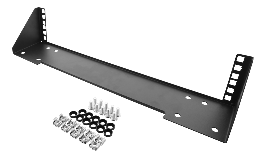 Vertikalt väggfäste med en höjd av 2U för att kunna installera switchar, patchpaneler eller andra 19"-enheter på väggen. Går även bra att använda under ett bord som illustreras i bilderna.