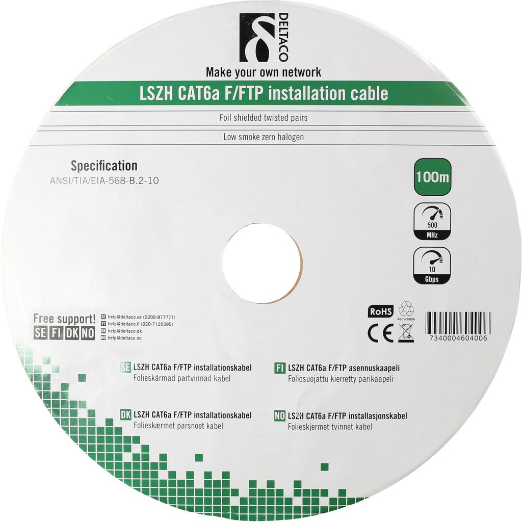 DELTACO F/FTP Cat6a installationskabel, LSZH, 100m trumma, 500MHz, Delta-certifierad, vit